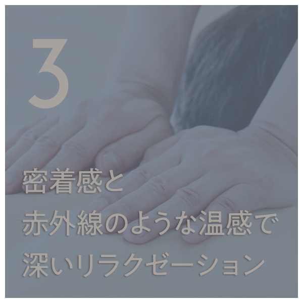 2 深く持続的な圧で機能改善 人体力学を最大限に活かす姿勢(ボディメカニクス)が 深層筋にまで届く力みのない深い圧を作り出します。 ひとつひとつの筋肉のすみずみまで、 あるいは筋肉やファシア(筋膜)のつながりに対し 的確に持続的に圧を届け、 短時間で効果的な機能改善を促します。